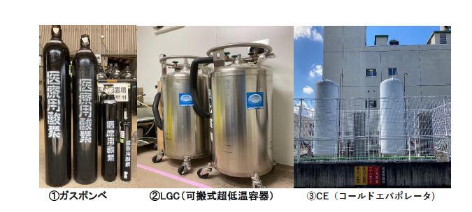 | ②LGC(可搬式超低温容器) | 酸素や窒素などの高圧ガスを液体で貯蔵し、より多くのガスを運べる容器です。 内槽と外槽の2重構造かつ真空断熱となっており、蒸発を最小限に抑えています。ガスボンベより長時間の供給が可能です。 |